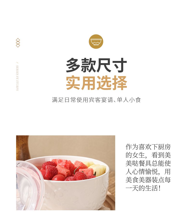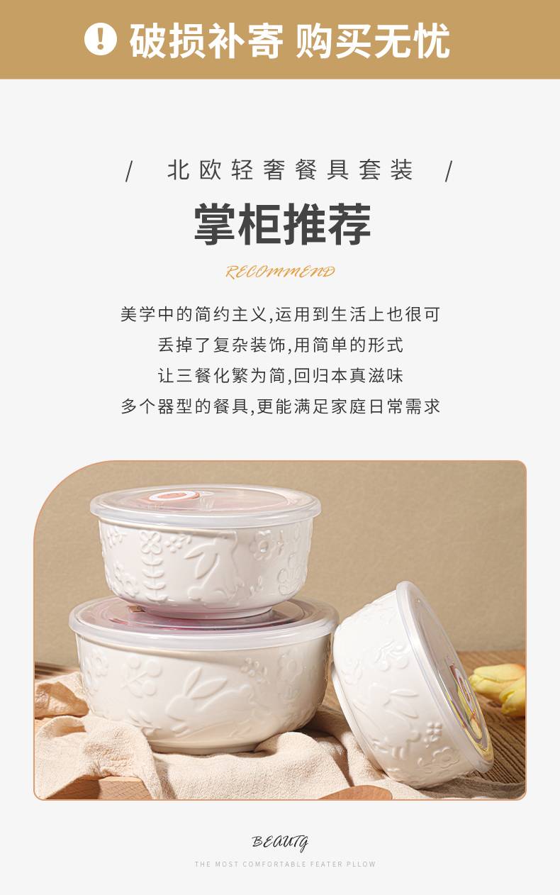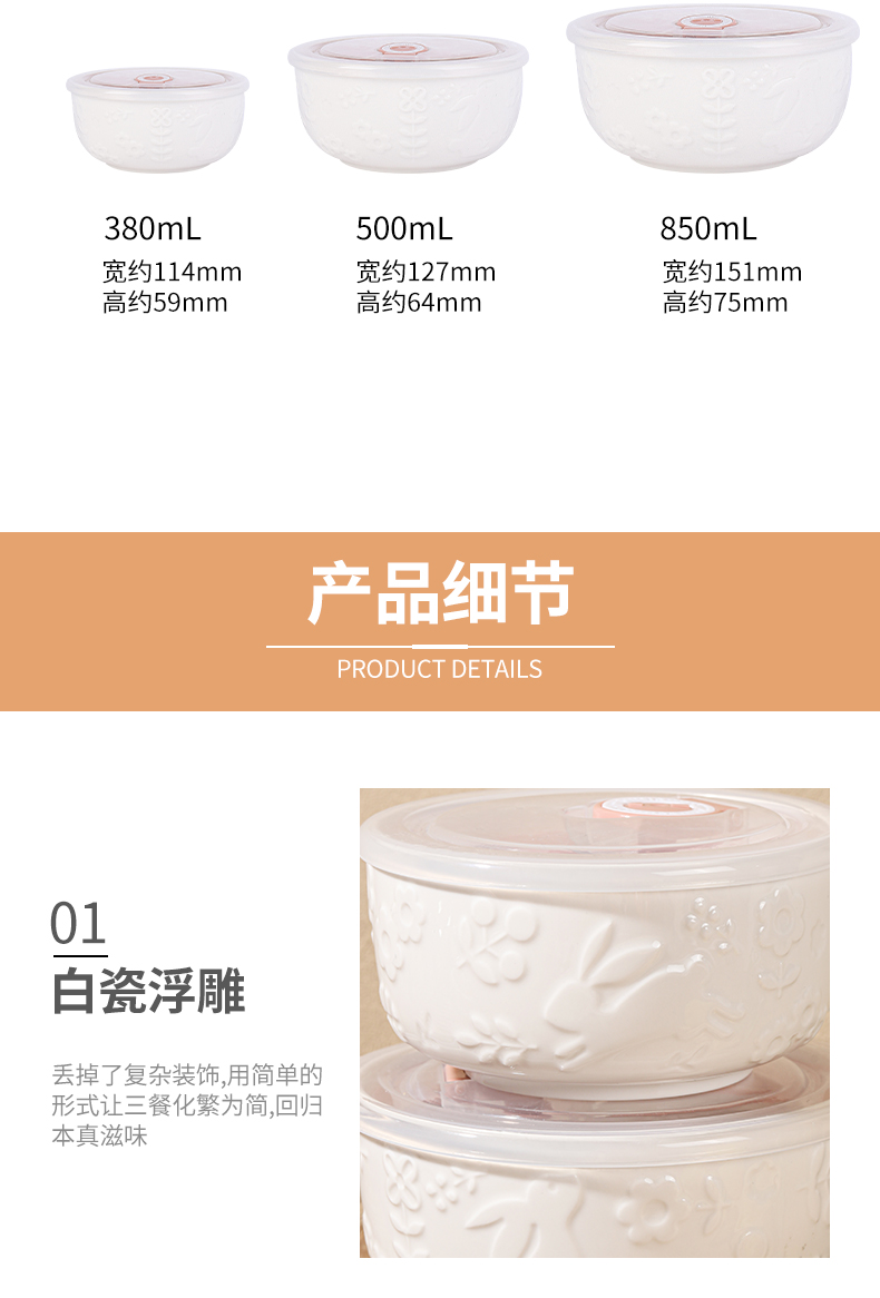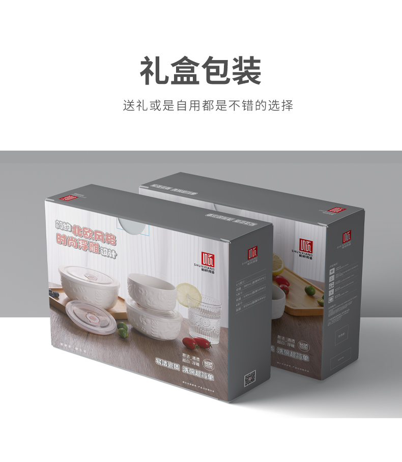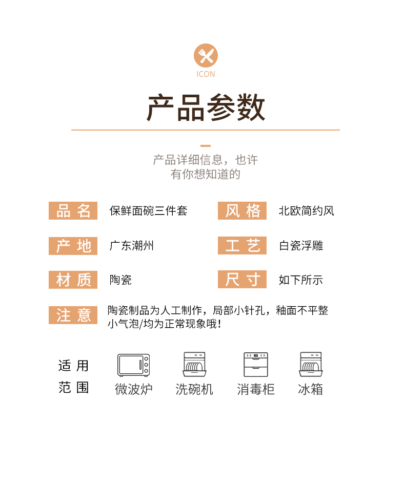 名稱:保鮮碗三件套 品牌:順祥 風(fēng)格:北歐簡約風(fēng) 工藝:白瓷浮雕 材質(zhì):陶瓷 產(chǎn)地:中國潮州 適用范圍: 微波爐、烤箱、消毒柜、洗碗機等