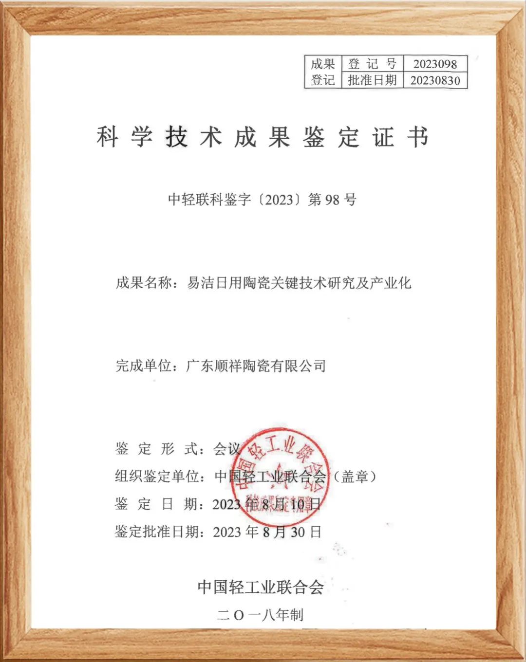 順祥研發(fā)團隊經(jīng)過持續(xù)不斷的努力,終獲國際級成果鑒定認可,在易潔陶瓷領域取得里程碑式的突破。