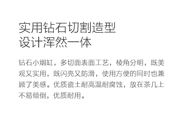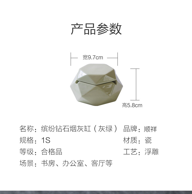 名稱:繽紛鉆石煙灰缸(灰綠) 品牌:順祥 工藝:浮雕 材質(zhì):瓷 產(chǎn)地:中國(guó)潮州 適用場(chǎng)景:書房、辦公室、客廳等