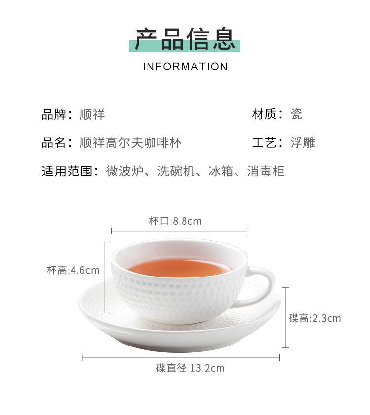 名稱:高爾夫純白咖啡杯套裝 品牌:順祥陶瓷 工藝:浮雕 材質(zhì):高溫陶瓷 產(chǎn)地:中國潮州 適用范圍: 微波爐、烤箱、洗碗機(jī)等
