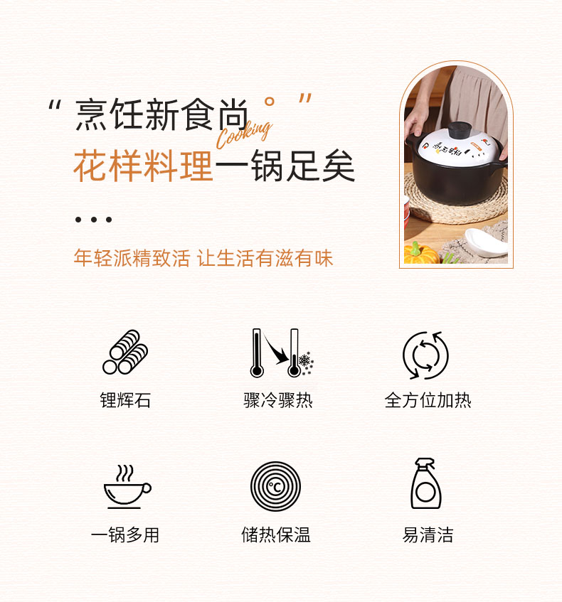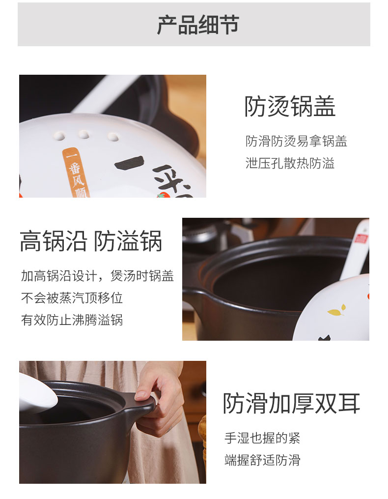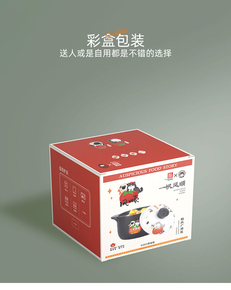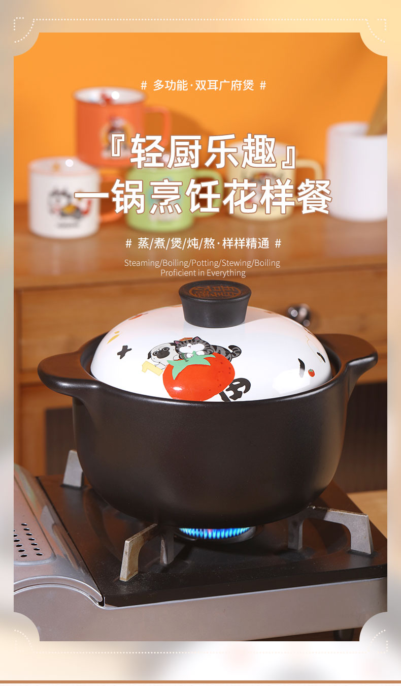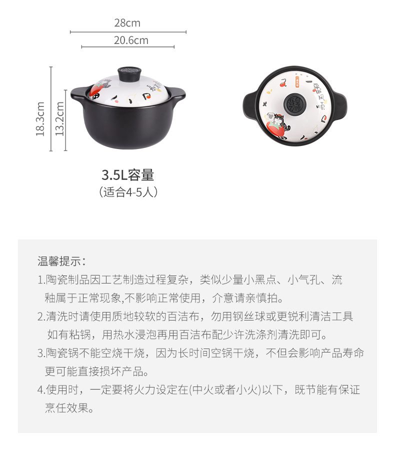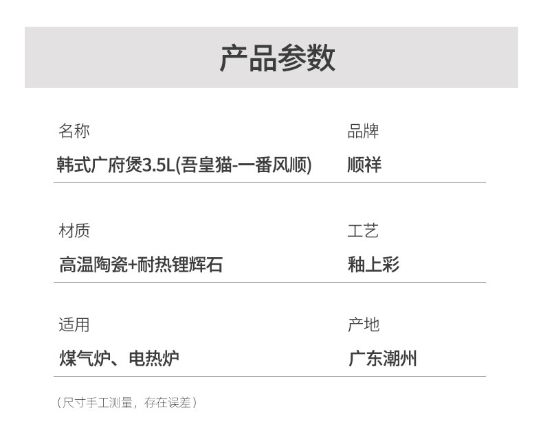 名稱:韓式廣府煲3.5L(吾皇貓-一番風(fēng)順) 品牌:順祥陶瓷 工藝:釉上彩 材質(zhì):高溫陶瓷+耐熱鋰輝石 產(chǎn)地:中國潮州 適用范圍: 煤氣爐、電熱爐